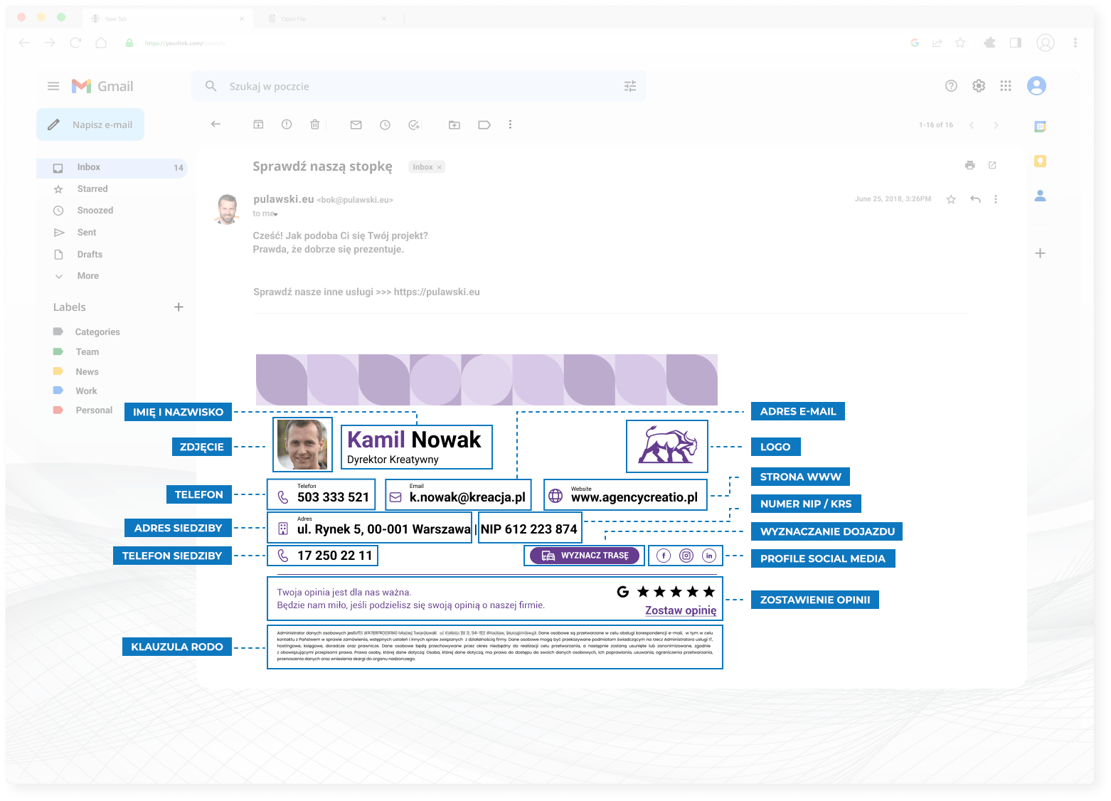 Kompleksowy zestaw elementów, które składają się na wizerunkową, funkcjonalną i technicznie kompatybilną stopkę e-mail, gotową do wdrożenia w Twojej firmie.